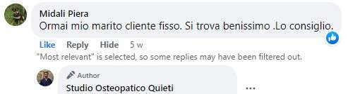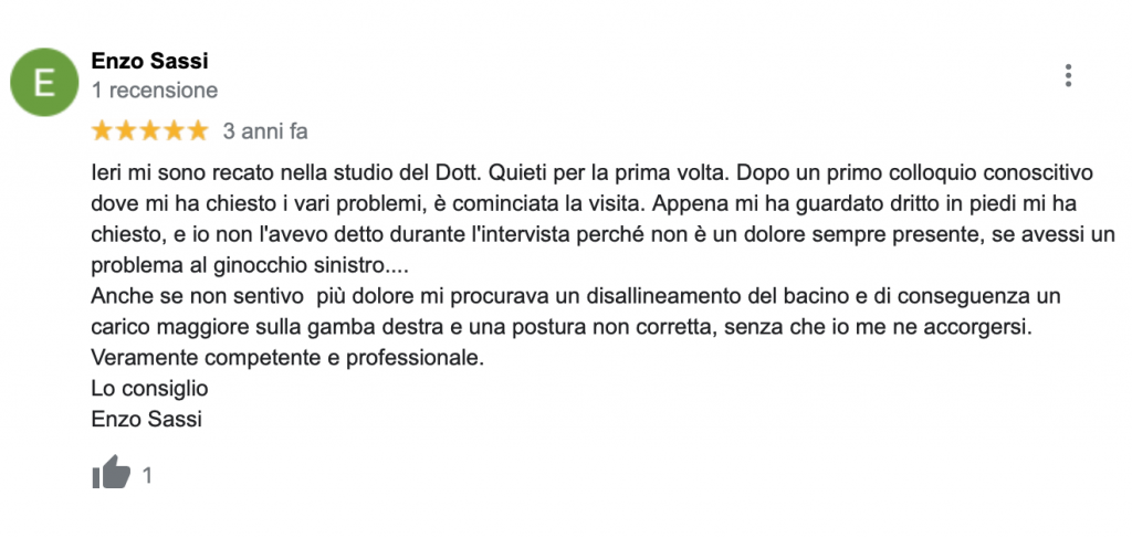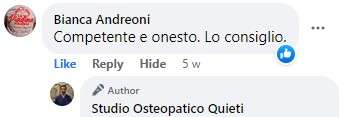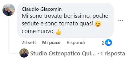 gian nicola malteseMolto professionale, puntuale,con sole 3 sedute ha risolto j miei problemi alla schiena, spalla e cervicali. Complimenti sinceri ConsigliatissimoTrustindex verifica che la fonte originale della recensione sia Google. Riganti StefaniaIl dottor Quieti, è molto preparato, esperto e molto gentile,mette a proprio agio il paziente, personalmente mi sono trovata molto bene perché è un professionista serio e capace, quindi lo consiglio a chiunque ha necessitàTrustindex verifica che la fonte originale della recensione sia Google. silvia angeloniIl Dott. Quieti è un professionista serio e di altissimo livello. In poche sedute ha risolto i dolori che trascinavo da anni. Consigliatissimo!!Trustindex verifica che la fonte originale della recensione sia Google. GiuseppeMi sono recato dallo Studio Osteopata Quieti, consigliato da un amico di Cernusco, con vari disturbi alla cervicale e schiena. (Premetto che arrivavo da una precedente deludente esperienza in un altro studio, che aveva addirittura peggiorato la situazione) Il Dottor Quieti da subito ha individuato le aree doloranti problematiche e con le sue tecniche, manovre ha ristabilito il mio benessere in poche sedute! Molto utili, efficaci e semplici gli esercizi consigliati da fare a casa. SUPER CONSIGLIATO!!!Trustindex verifica che la fonte originale della recensione sia Google. Nicholas PaielliOttima esperienza. Mi ha aiutato in una fase delicata della preparazione della Maratona.Trustindex verifica che la fonte originale della recensione sia Google. laura pietroforteMi sono recata dal dr Quieti per dolori lombari causati da discopatia ed ernia sinistra. Fin dal primo trattamento i dolori si sono attenuanti, fino a scomparire del tutto. Consiglio il dr Quieti per competenza e chiarezza nello spiegare il piano di recupero con esercizi mirati al problema.Trustindex verifica che la fonte originale della recensione sia Google. Michele SchivardiBravo professionista, propositivo, da' consigli pratici per gestire in autonomia i problemi individuali (es. esercizi mirati) e molto onestamente non propone ulteriori sedute se non necessarie. Consigliato!Trustindex verifica che la fonte originale della recensione sia Google. Veronica AmericolaProfessionale e competente, gentile e cortese. Consiglio a tutti un trattamento con lui.Trustindex verifica che la fonte originale della recensione sia Google. Germana BuzzoniVolevo condividere un esperienza altamente positiva. Soffro di cervicale e dopo numerosi tentativi con esami e fisioterapisti nn sono Mai riuscita a risolvere o almeno allegerire il mio dolore soprattutto notturno. Ho avuto questo nominativo da mia nipote. Sono andata e devo dire che sto decisamente meglio. Il dolore mi è sparito con le sue manipolazioni ed esercizi semplissimi da fare a casa. Sono andata solo tre volte ed è onesto sia come costo ed informare quante sedute servono (nn molte). Veramente ottimo. Lo consiglio vivamente!! GermanaTrustindex verifica che la fonte originale della recensione sia Google. Chiara CarlettiRingrazio l'osteopata Matteo Quieti per avermi rimesso in piedi dopo un forte attacco di vertigini/cervicalgia e per la professionalità dimostrata. Lo consiglio anche per la sua disponibilità nel rispondere in tempi celeri alle richieste di appuntamento.Trustindex verifica che la fonte originale della recensione sia Google.